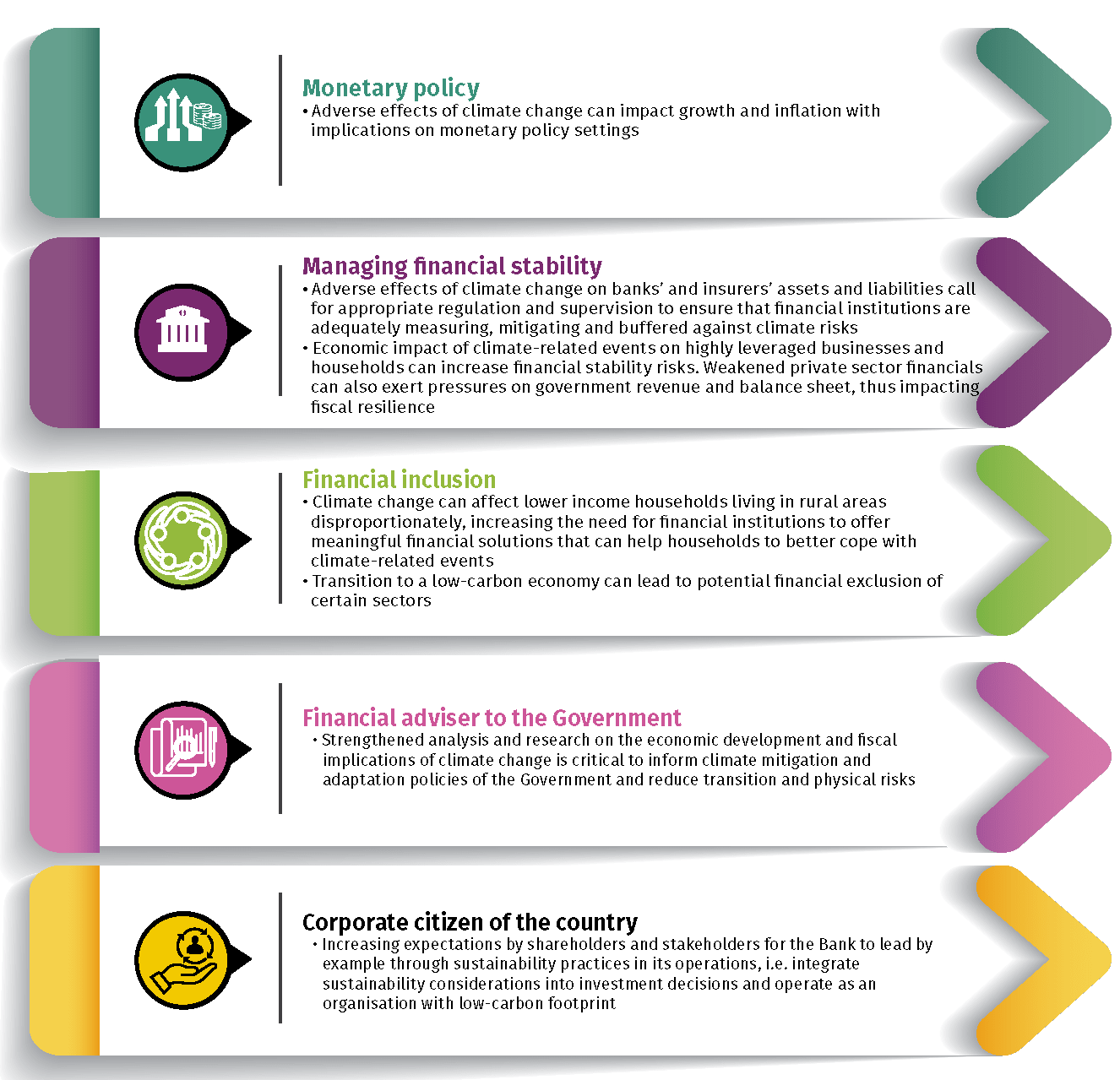 Our climate strategies both contribute to, and are informed by, Malaysia’s national strategies to meet national commitments made under the Paris Agreement 2015. BNM's approach to climate risk is supported by six tracks of BNM's key functions.