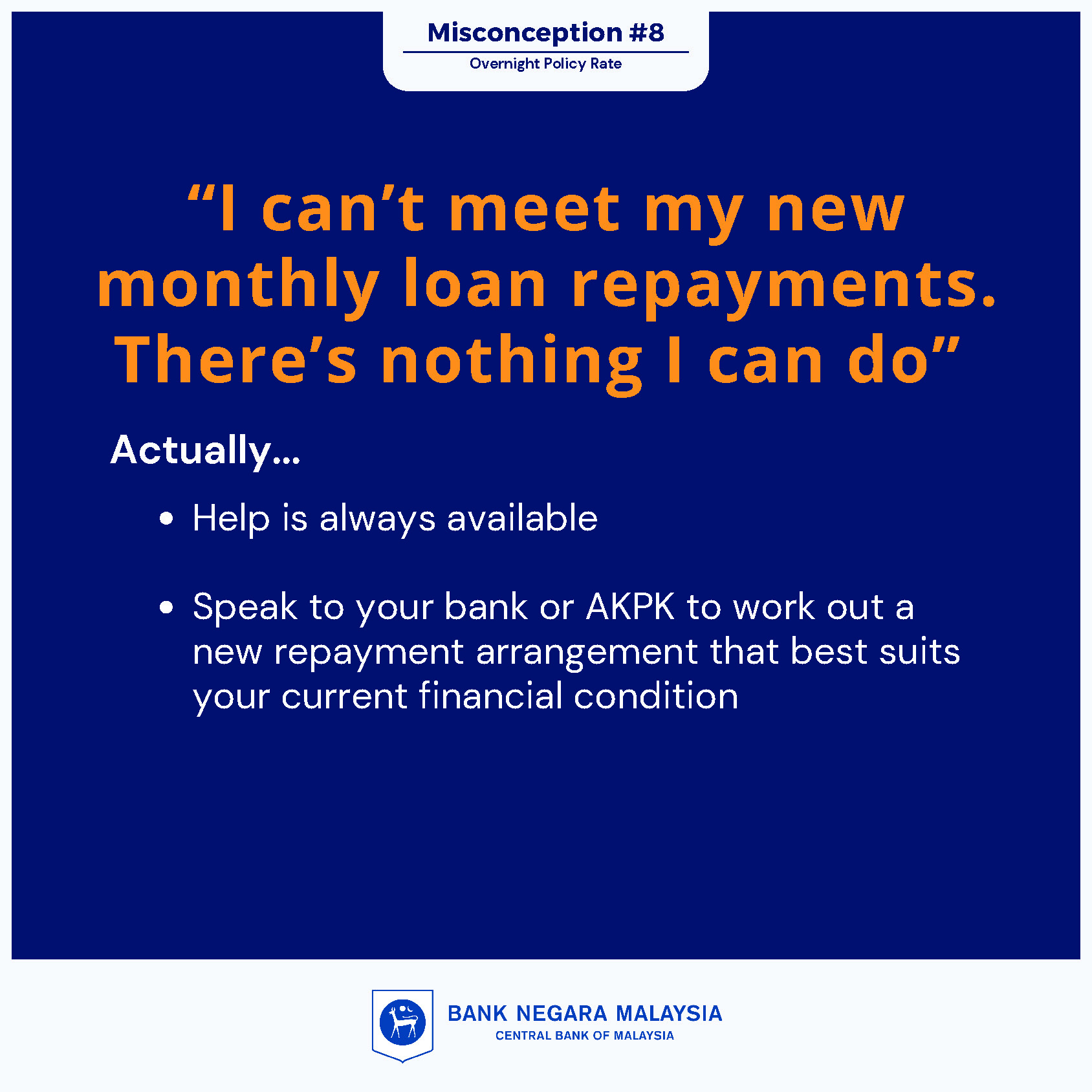 - We understand that the increase in interest rates may be more difficult to handle for some. Help is available. If you are having trouble repaying your monthly loan instalments, the best thing you can do is get in touch with your banks or the Credit Counselling and Debt Management Agency (Agensi Kaunseling & Pengurusan Kredit, AKPK) as soon as you can to learn about the support options available.