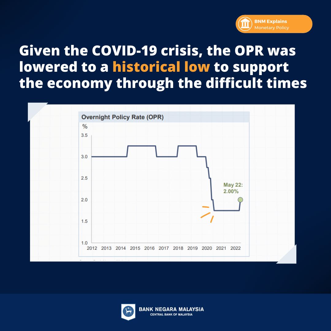 - The OPR was the lowest at 1.75% from July 2020 until May 2022 to support the economy during the COVID-19 pandemic. In tough times, low interest rates make borrowing cheaper and lowers the returns on savings. This spurs spending, boosts investments and protects jobs and income in times of crisis.