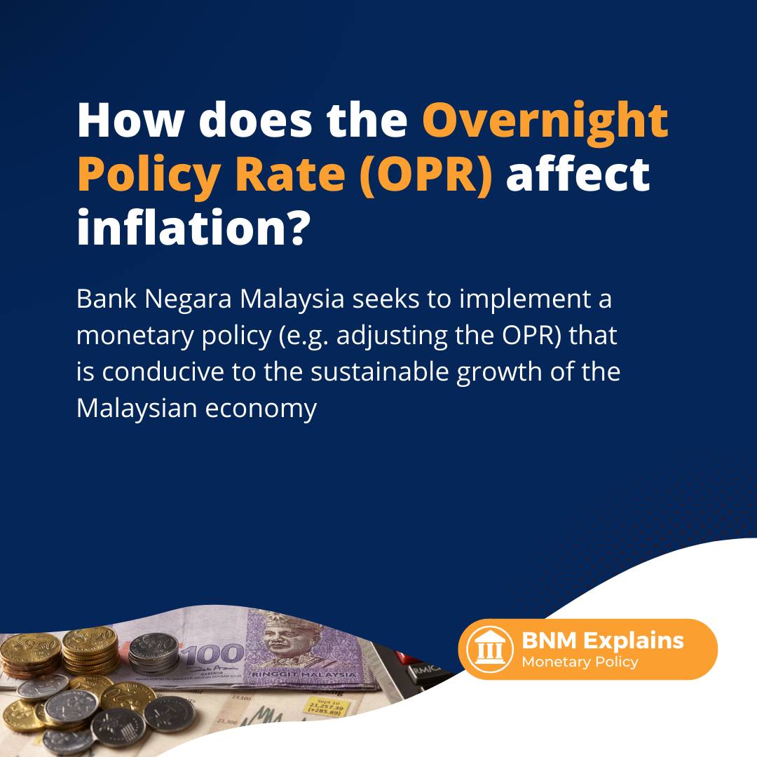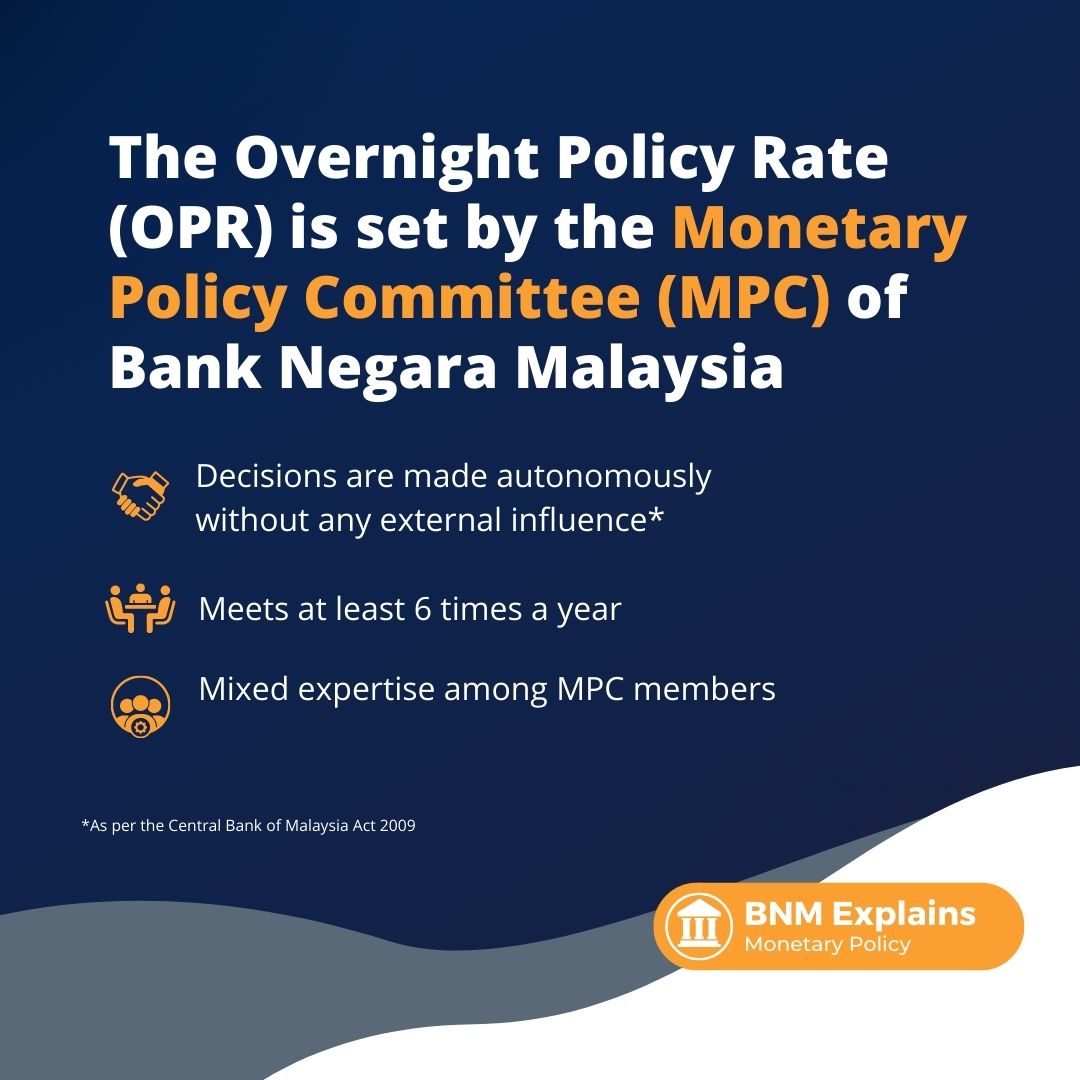 - The MPC sets monetary policy by changing the Overnight Policy Rate (OPR). The OPR is BNM’s policy interest rate that influences, among others, banks’ lending and financing rates, as well as deposit rates. These rates tell you how much the cost of loan is, or how much the returns are for deposits. They are applicable for both conventional and Islamic finance products. To keep things simple, we refer to these as ‘interest rates’ for this FAQ.
