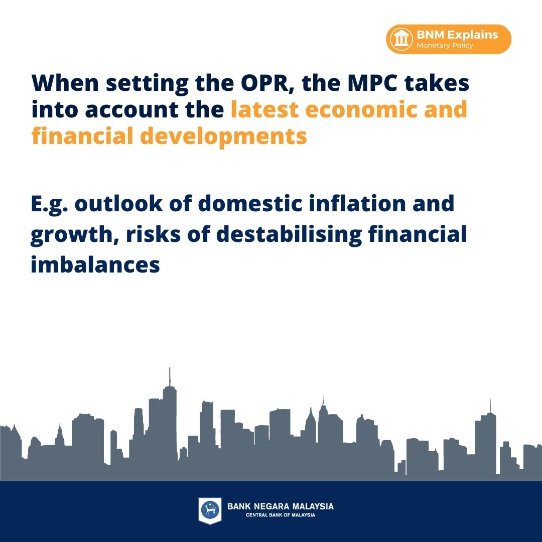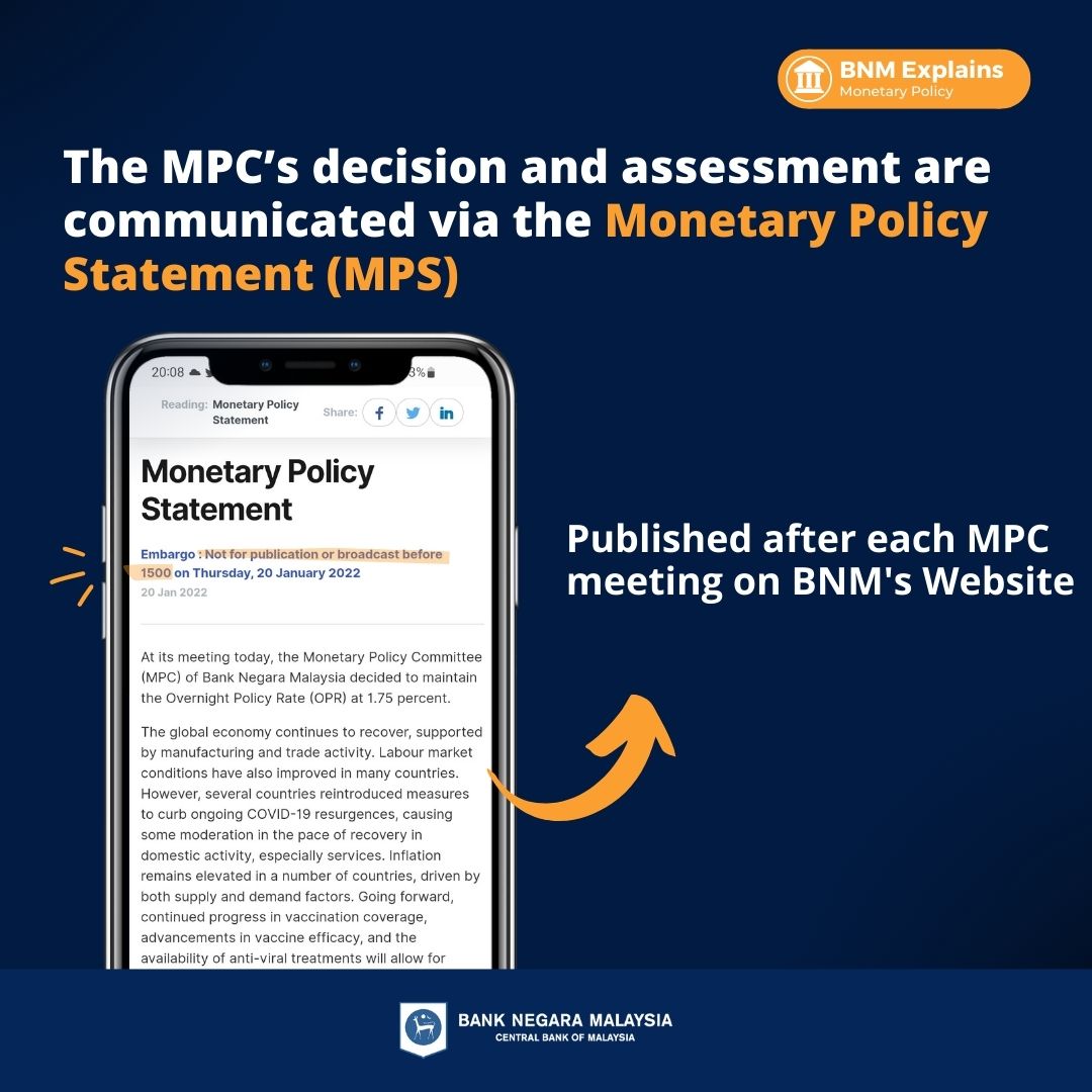 BNM, through its Monetary Policy Committee (MPC), executes its monetary policy responsibility by adjusting its policy interest rate (Overnight Policy Rate, or OPR). The OPR is the sole indicator used to signal the stance of monetary policy, and is announced through the Monetary Policy Statement (MPS) released after the MPC meeting.